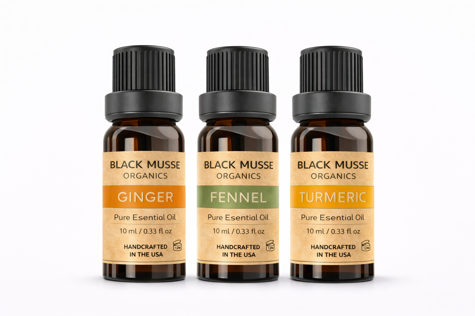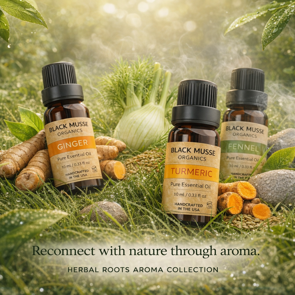 BLACK MUSSE Organics – Essential Oil Trio for Rituals & Aromatic ExperiencesElevate your sensory routines with the Herbal Roots Essential Oil Set by BLACK MUSSE Organics. This carefully curated trio — Ginger, Fennel, and Turmeric essential oils — brings together warm, earthy, and herbal aromas ideal for diffusers, relaxation rituals, and wellness-inspired aromatherapy.