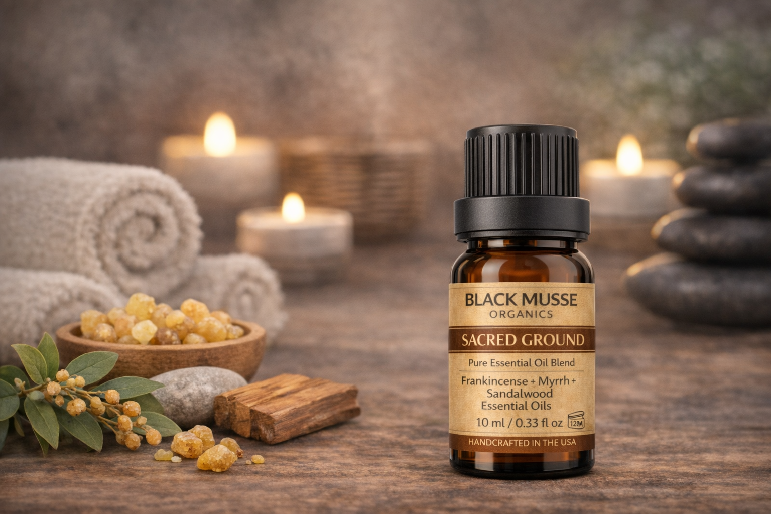10 ml / 0.33 fl oz • Amber Glass BottleOur Sacred Ground Essential Oil Blend by Black Musse Organics is a carefully crafted, undiluted blend of Frankincense, Myrrh, and Sandalwood. This grounding aroma is warm, resinous, and deeply earthy, designed for moments of stillness, reflection, and intentional aromatherapy rituals.